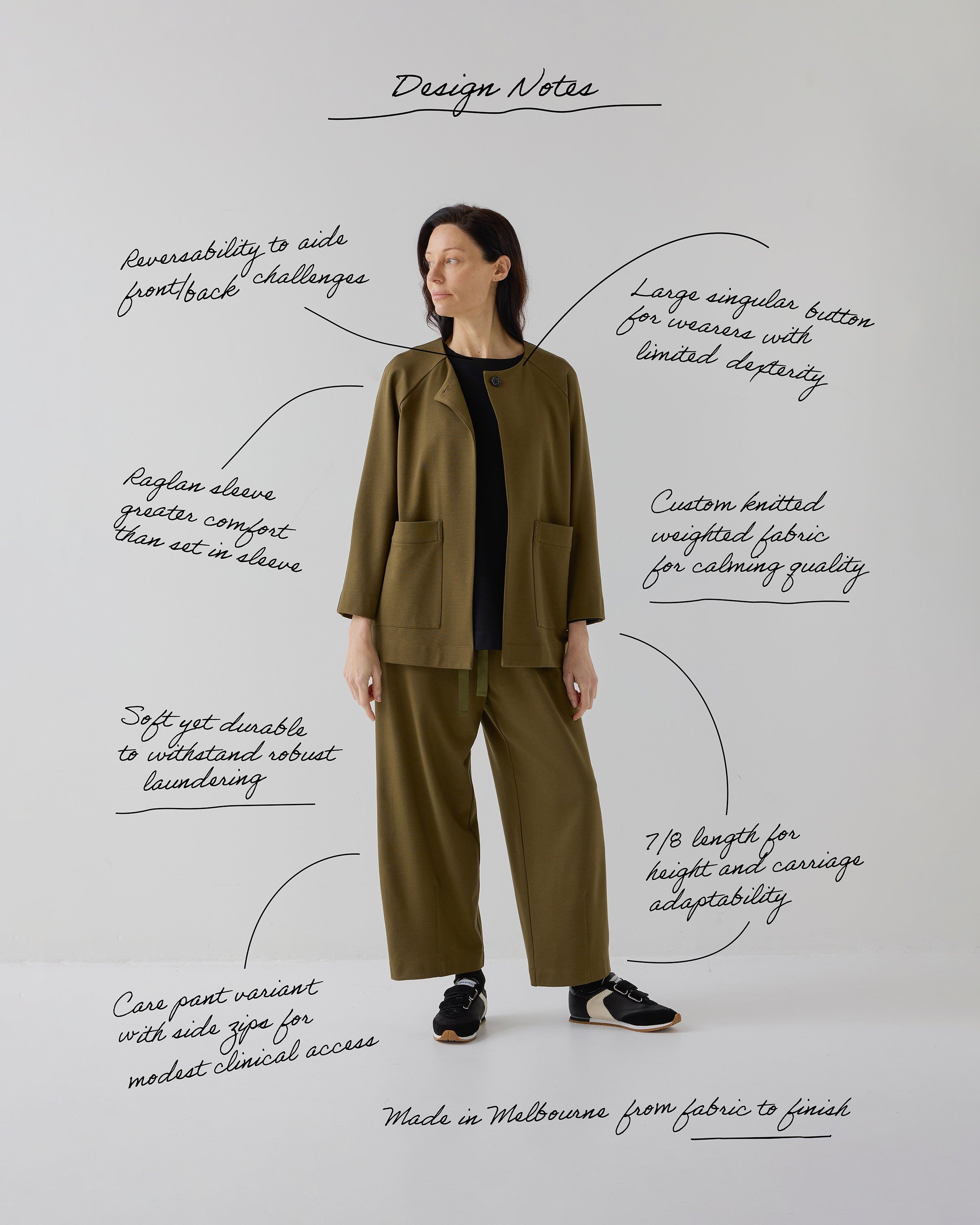 While care is at the core of every piece in our collection, we created The Care Pant to go a little bit further. A variant of The Relaxed Pant — offering the quality of a tailored trouser with the comfort to lounge — it adds discreet side zips for modest access, supporting wearers or carers with wound care, clinical aides and other accessibility needs without compromising comfort or dignity.